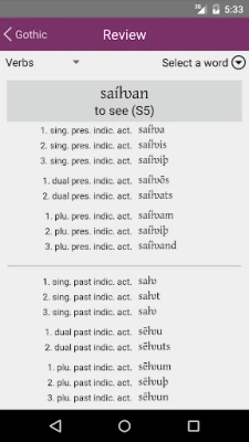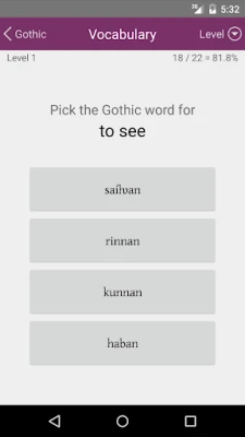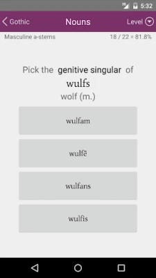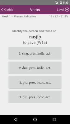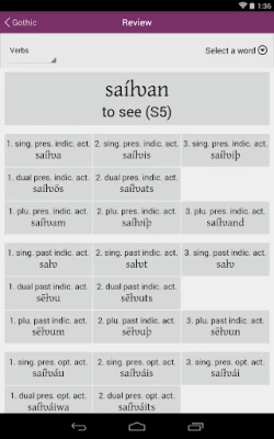 Liberation Philology Gothic செயலியில், சொல்லகராதிப் பகுதி 160 நிலைகளைக் கொண்டுள்ளது, ஒவ்வொரு நிலையும் ஆங்கிலம் மற்றும் கோதிக் மொழிக்கு இடையே 10 சொற்களின் மொழிபெயர்ப்பைச் சோதிக்கும். இவற்றிற்கிடையே, முன்னர் கற்றுக்கொண்டவற்றை மீளாய்வு செய்யும் ஒருங்கிணைந்த நிலைகளும் உள்ளன, மொத்தம் 181 விரிவான நிலைகள் காத்திருக்கின்றன. இலக்கணத்தைப் பொறுத்தவரை, கோதிக் பெயர்ச்சொற்களின் அனைத்து வகைகளையும் பகுப்பாய்வு செய்யவும், அவற்றின் பல்வேறு மாற்றங்களைப் புரிந்துகொள்ளவும் பிரத்தியேகப் பிரிவுகள் உள்ளன. அதேபோல, கோதிக் வினைச்சொற்களின் அனைத்துப் பிரிவுகளையும் பகுப்பாய்வு செய்யவும், அவற்றின் சரியான வடிவங்களை உருவாக்குவதற்கும் ஆழமான பயிற்சிகள் வழங்கப்படுகின்றன.