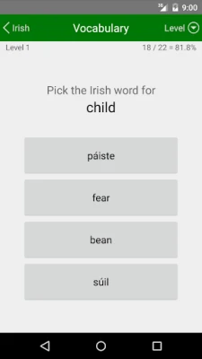 ஐரிஷ் மொழியைக் கற்கத் தொடங்குபவர்களுக்கும், தங்கள் அறிவை ஆழப்படுத்த விரும்புபவர்களுக்கும் ஒரு முழுமையான வழிகாட்டியாக இந்தச் செயலி வடிவமைக்கப்பட்டுள்ளது. மொழி அறிவின் அடித்தளமாக விளங்கும் சொற்களஞ்சியத்தை வலுப்படுத்த, 450 தனித்துவமான நிலைகளில் தலா 10 ஐரிஷ் மற்றும் ஆங்கில சொற்களுக்கு இடையே மொழிபெயர்ப்பு திறனை சோதிக்கலாம். நீங்கள் கற்றதை மீண்டும் நினைவுபடுத்தும் 56 தொகுப்பு நிலைகளுடன் சேர்த்து, மொத்தம் 506 சுவாரஸ்யமான நிலைகளில் உங்கள் சொற்களஞ்சிய அறிவை படிப்படியாக மேம்படுத்திக்கொள்ளலாம். ஒவ்வொரு மட்டமும் உங்கள் கற்றலை வலுப்படுத்தி, புதிய சொற்களை எளிதாக உள்வாங்க உதவும் வகையில் நுட்பமாக உருவாக்கப்பட்டுள்ளது.
