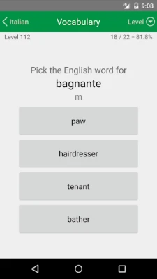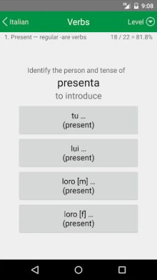 சொல்லகராதிப் பிரிவில் 500 தனித்துவமான நிலைகள் உள்ளன. ஒவ்வொரு நிலையிலும், ஆங்கிலம் மற்றும் இத்தாலியன் ஆகிய இரு மொழிகளிலும் 10 புதிய சொற்களின் மொழிபெயர்ப்பை நீங்கள் பயிற்சி செய்யலாம். இவற்றுடன், முன்பு கற்றுக்கொண்ட சொற்களை மீள்பார்வை செய்யும் தொகுப்பு நிலைகளும் (மொத்தம் 563 நிலைகள்) இடையிடையே சேர்க்கப்பட்டு, உங்கள் புரிதலை உறுதிப்படுத்துகின்றன. இது உங்கள் சொல்லகராதி அறிவை விரிவுபடுத்துவதோடு மட்டுமல்லாமல், அதை நினைவில் வைத்திருக்கவும் உதவுகிறது.